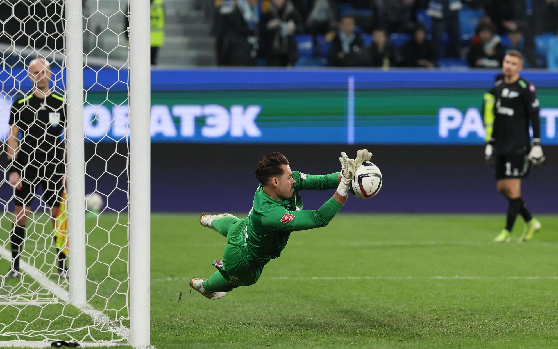 После просмотра судья показал желтую зенитовцу и назначил пенальти. К точке подошел Барко и... То ли спижонил, то ли просто не определился, в какой угол направить мяч. В итоге покатил слабо низом прямо по центру — Латышонок, немного опешивший, переложился, сначала отразил мяч перед собой, а потом взял намертво.